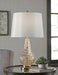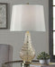 Let this table lamp feed your design appetite. The curvy silhouette permeates your room with contemporary romance, while the champagne-hued glass body is a soft and feminine finish. A brass-tone base finesses the look with a sleek touch.
