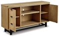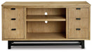 The fresh, organic look of this TV stand with electric fireplace has a simple feel that complements your clean and cozy living room with ease. The natural tone has casual sensibility, while matte black legs add contemporary flair. What really turns up the heat: an electric infrared fireplace insert with faux firebrick surround that operates with or without infrared heat. It includes a multi flame feature, 7-level temperature setting, five brightness levels and an LED glowing embers effect.